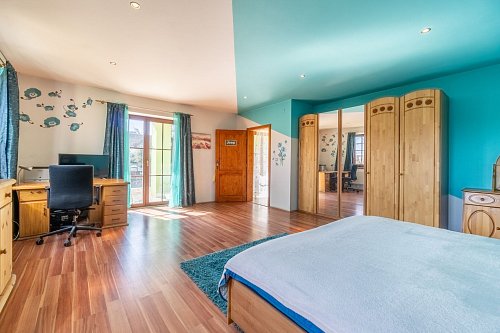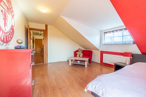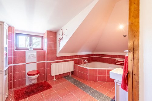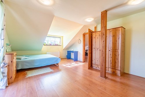 V prvním patře naleznete tři velké pokoje s balkonem, malou šatnu a prostornou koupelnu s vanou a s toaletou.