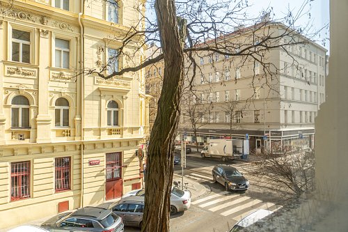 Nachází se v 1. patře se vstupem z ulice Korunní, přičemž okna směřují do klidnější ulice Nitranská. Díky tomu nabízí ideální kombinaci pulzujícího města a klidného bydlení.