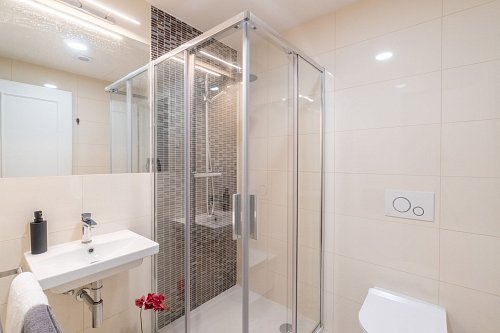 • plně zařízený – ložnice s kvalitní postelí, velkou skříní a komodou; kuchyň vybavena lednicí, myčkou, indukční deskou a sporákem; koupelna se sprchovým koutem a WC
